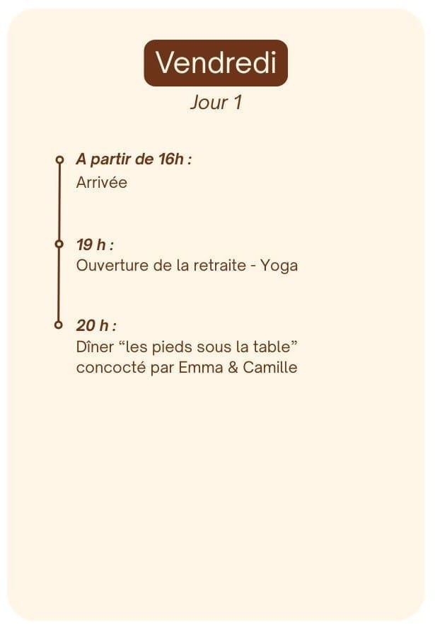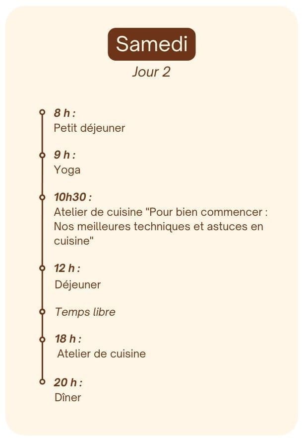 Non, tu n’y es pas obligé.e ! Tu es invité.e à participer à tous les ateliers de cuisine et pratiques de yoga du week-end, mais si tu souhaites te reposer ou faire autre chose pendant une des activités c’est totalement possible.