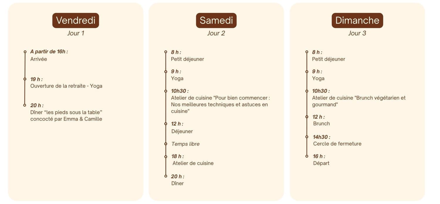 Non, tu n’y es pas obligé.e ! Tu es invité.e à participer à tous les ateliers de cuisine et pratiques de yoga du week-end, mais si tu souhaites te reposer ou faire autre chose pendant une des activités c’est totalement possible.