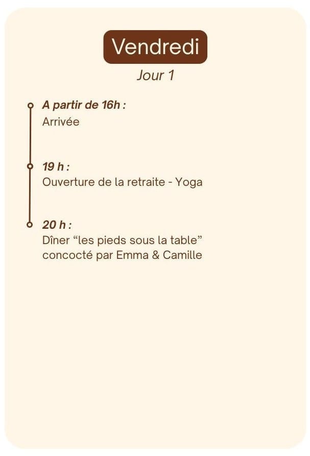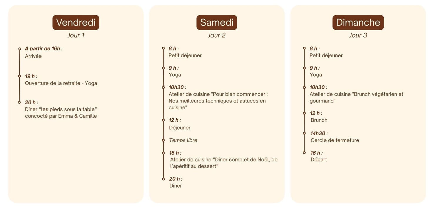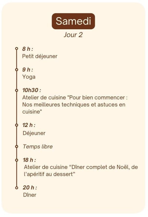 Non, tu n’y es pas obligé.e ! Tu es invité.e à participer à tous les ateliers de cuisine et pratiques de yoga du week-end, mais si tu souhaites te reposer ou faire autre chose pendant une des activités c’est totalement possible.